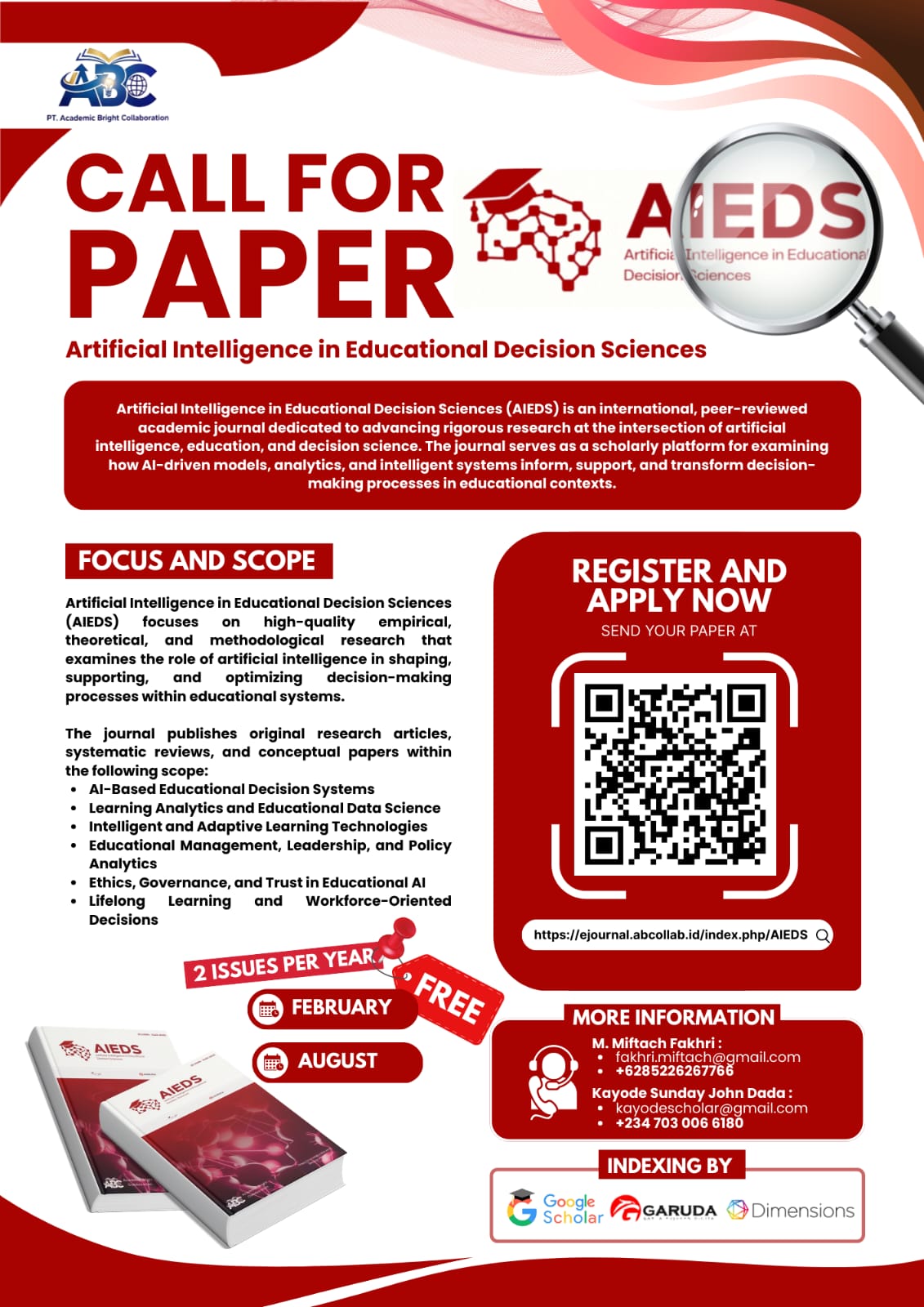 Artificial Intelligence in Educational Decision Sciences (AIEDS) is an international, peer-reviewed academic journal dedicated to advancing rigorous research at the intersection of artificial intelligence, education, and decision sciences. The journal serves as a scholarly platform for examining how AI-driven models, analytics, and intelligent systems inform, support, and transform decision-making processes across educational contexts.
