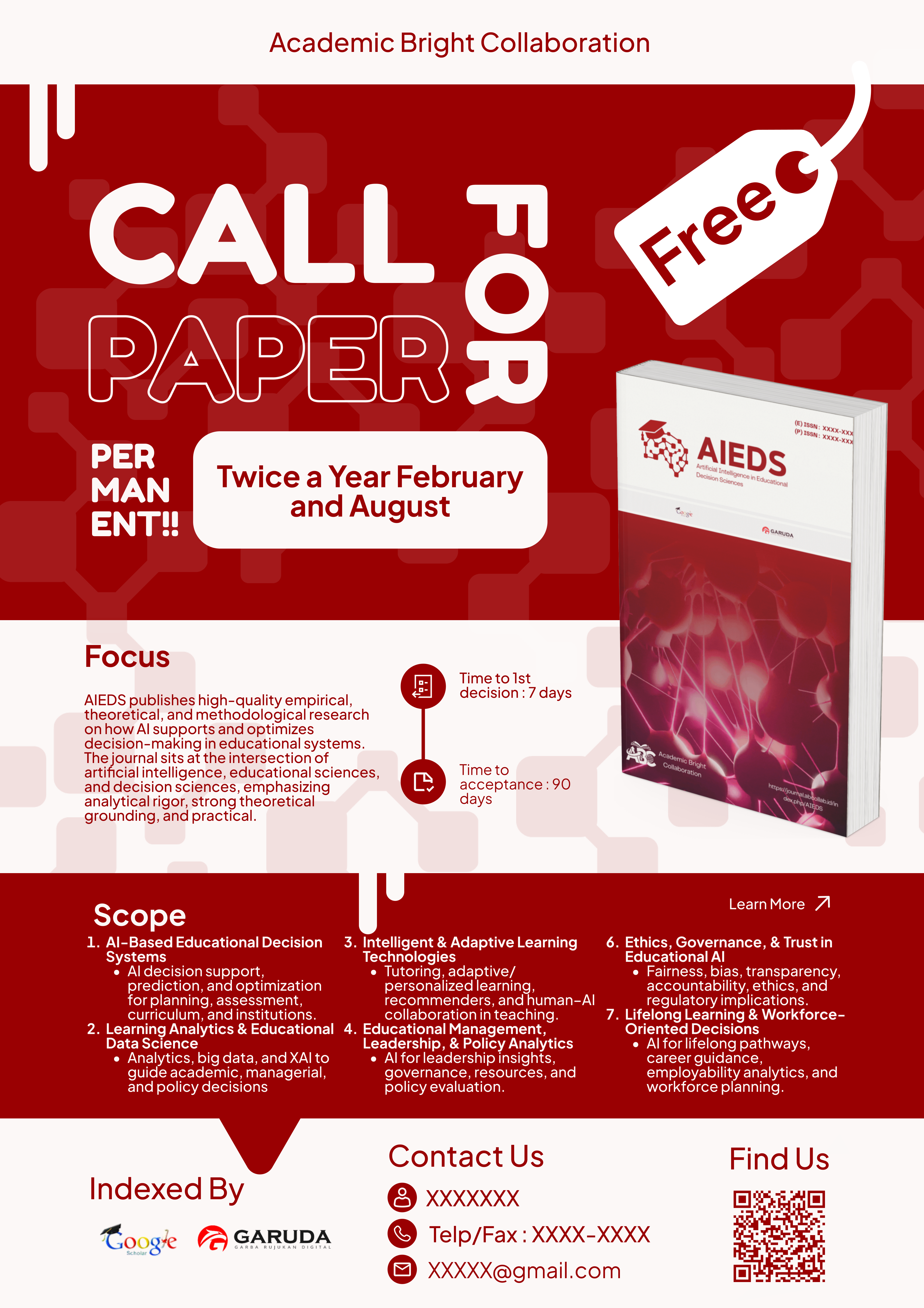 Artificial Intelligence in Educational Decision Sciences (AIEDS) is an international, peer-reviewed academic journal dedicated to advancing rigorous research at the intersection of artificial intelligence, education, and decision sciences. The journal serves as a scholarly platform for examining how AI-driven models, analytics, and intelligent systems inform, support, and transform decision-making processes across educational contexts.